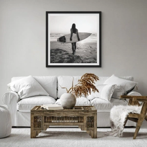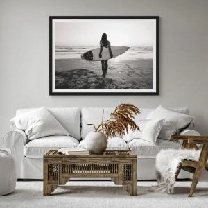 Affiche dans un cadre noir - Poster - Femme avec planche de surf sur la plage en noir et blanc - 70x50cm - Fille des vagues de la mer - Décoration murale moderne pour le salon et la chambre ARTTOR