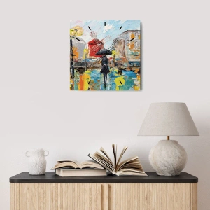 Le modèle « Légendes parisiennes » est une horloge murale qui nous transporte au cœur artistique de Paris. Le cadran présente une scène urbaine peinte à la main, pleine d'expression et de couleur, avec une femme en manteau et parapluie marchant sur un trottoir mouillé. L'arrière-plan, un moulin à vent rouge caractéristique, ajoute une atmosphère parisienne et mystérieuse à la composition.