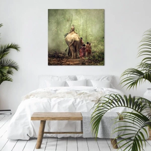 Impression sur toile - Image sur toile - Enfants avec un éléphant dans une forêt verte à la lumière du matin - 50x70cm - Nouveau livre de la jungle - Décoration murale moderne pour le salon et la chambre ARTTOR