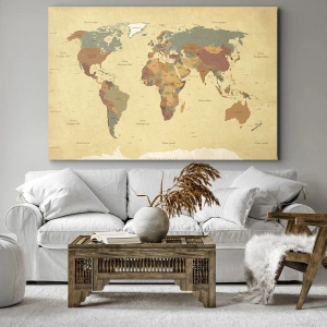 Impression sur toile - Image sur toile - Une carte du monde stylisée dans des tons de beige et de couleurs pastel. - 70x50cm - Pour vous - le monde entier - Décoration murale moderne pour le salon et la chambre ARTTOR