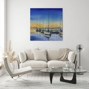 - Une peinture sur verre représentant des voiliers amarrés dans un port au coucher du soleil. Les couleurs chaudes et l'eau calme créent une atmosphère nautique relaxante, parfaite pour les intérieurs modernes.