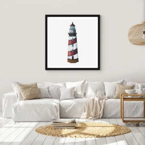 Affiche dans un cadre noir - Poster - Une image de dessin animé d'un phare avec des rayures rouges et blanches sur un fond minimaliste. - 70x50cm - Toujours sur ses gardes - Décoration murale moderne pour le salon et la chambre ARTTOR