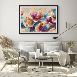 Affiche dans un cadre noir - Poster - Fleurs colorées sur fond beige - 70x50cm - Splendeur colorée du bouquet - Décoration murale moderne pour le salon et la chambre ARTTOR