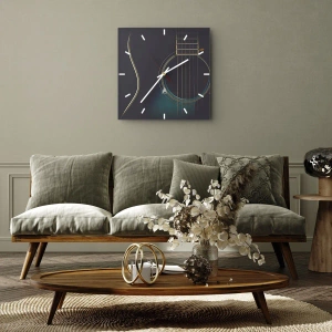 L'horloge murale « Un instant avant le son » est une proposition pour les amateurs de musique et d'élégance subtile. Le motif graphique montre un détail net de la table d'harmonie d'une guitare acoustique, avec des cordes visibles et un fragment du manche, créant une composition efficace et harmonieuse.