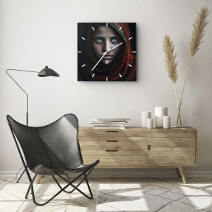L'Horloge murale Princesse orientale est une composition extrêmement expressive basée sur le portrait d'une jeune fille au foulard rouge. Le point central du tableau est un regard hypnotisant, dont l'intensité focalise l'attention et crée une atmosphère de profonde réflexion. Le visage du modèle est illuminé par une lumière douce qui contraste avec le fond sombre et le tissu qui l'entoure.