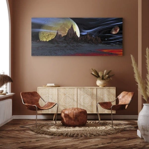 - Un paysage fantastique saisissant avec des planètes, des volcans et un ciel rouge intense. La décoration idéale pour les amateurs de fantasy et d'espace.