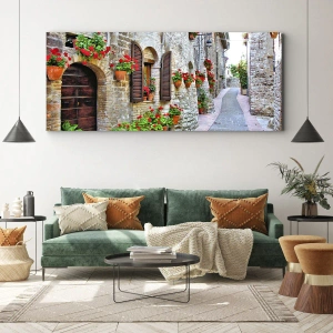 Impression sur toile - Image sur toile - Une rue étroite avec des bâtiments en pierre décorés de pots de fleurs - 70x50cm - Ambiance italienne - Décoration murale moderne pour le salon et la chambre ARTTOR