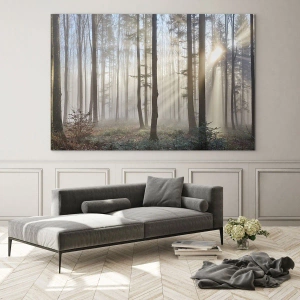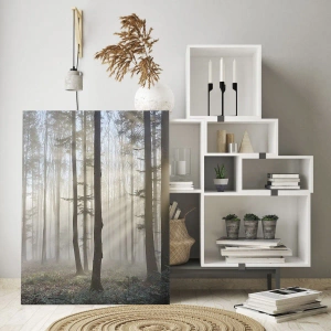 Impression sur verre - Image sur verre - Les rayons du soleil du matin pénètrent la forêt brumeuse - 50x70cm - Le brouillard s'est aussi réveillé - Décoration murale moderne pour le salon et la chambre ARTTOR