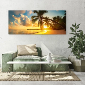Impression sur verre - Image sur verre - Plage tropicale avec palmiers au coucher du soleil - 50x70cm - Rêve caribéen - Décoration murale moderne pour le salon et la chambre ARTTOR
