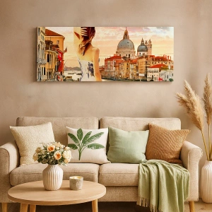 Les couleurs du tableau sont basées sur des nuances chaudes d'orange, d'or et de rose, qui confèrent à la composition profondeur et subtilité. Des détails tels que la lumière délicate se reflétant sur l'eau et l'ornementation architecturale des bâtiments soulignent l'expression artistique de l'œuvre. C'est un choix parfait pour les amoureux de paysages romantiques et ceux qui apprécient l'élégance artistique.
