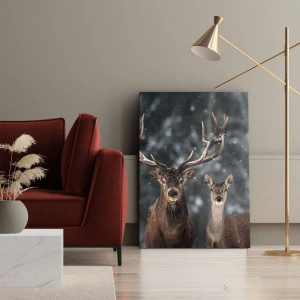 Impression sur toile - Image sur toile - Cerf dans une forêt d'hiver enneigée - 50x70cm - Le roi de la forêt avec sa femme - Décoration murale moderne pour le salon et la chambre ARTTOR