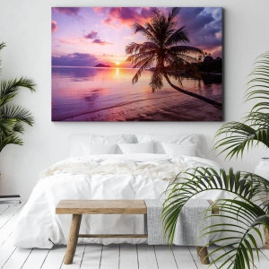 - Ce tableau représente une plage tropicale avec un palmier baigné par la lumière du soleil couchant, créant un décor pittoresque et apaisant. Il est idéal pour les intérieurs inspirés par la nature et l'exotisme.
