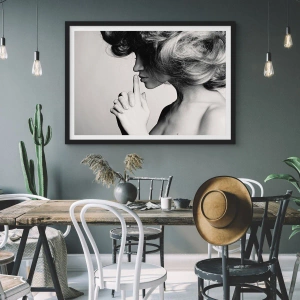 Affiche dans un cadre noir - Poster - Profil noir et blanc d'une femme faisant un geste de silence - 70x50cm - A l'écoute d'elle-même - Décoration murale moderne pour le salon et la chambre ARTTOR