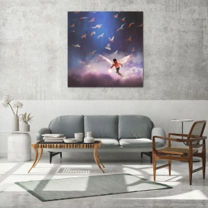 Impression sur verre - Image sur verre - Une silhouette avec des ailes d'ange flottant parmi les nuages - 50x70cm - Il faut de l'imagination et du courage - Décoration murale moderne pour le salon et la chambre ARTTOR