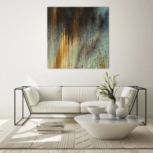 La peinture sur verre est faite sur un verre de 4 mm d'épaisseur. Les bords du verre ont une arête trapézoïdale mate. La tableau est sûr à l'utilisation et prêt à être accroché - il a des crochets en métal attachés à l'arrière du cadre et des entretoises en mousse permettant la régulation uniforme de la distance du tableau au mur.