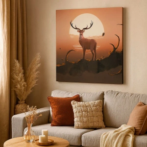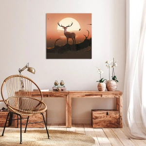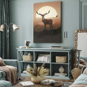 • Un tableau magique représentant un cerf sur fond de soleil couchant et d'un paysage surréaliste, parfait pour les intérieurs pleins de sophistication.