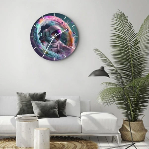 - Une horloge murale ornée d'un motif coloré représentant un astronaute entouré de teintes cosmiques rappelant un portail. Une décoration futuriste et dynamique au caractère fantastique.