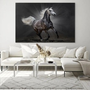 - Un tableau dynamique représentant un cheval au galop sur un fond sombre avec un effet de lumière. Une composition saisissante, idéale pour les intérieurs modernes.