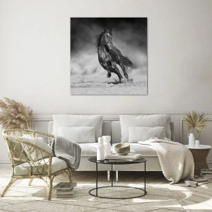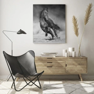Impression sur verre - Image sur verre - Un cheval noir galopant sur le sable en noir et blanc. - 70x50cm - Digne de l'émir lui-même - Décoration murale moderne pour le salon et la chambre ARTTOR