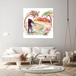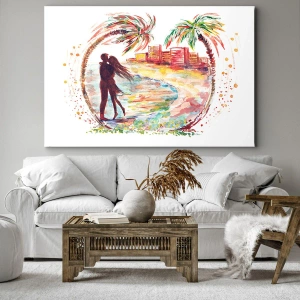 Impression sur toile - Image sur toile - Scène de couple romantique sur une plage avec des palmiers à l'aquarelle - 50x70cm - Vacances romantiques - Décoration murale moderne pour le salon et la chambre ARTTOR