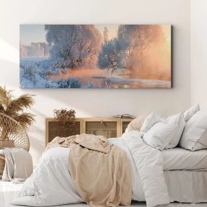 - Un paysage hivernal magique, avec ses arbres enneigés baignés par les rayons du soleil couchant. La rivière reflète délicatement la lumière, créant une atmosphère de paix et d'harmonie. Un ajout parfait aux intérieurs élégants.