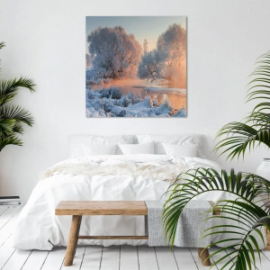 Les rayons du soleil pénétrant à travers les branches des arbres confèrent au paysage un aspect délicat et radieux. Cette scène évoque la paix et l'harmonie hivernales, s'intégrant parfaitement au style minimaliste de la décoration intérieure. La composition est incroyablement pittoresque et le travail minutieux vous permet d'apprécier la beauté de la nature.