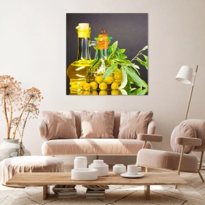 Le motif d'huile d'olive et de feuilles vertes fait référence à la nature et à une alimentation saine. C'est un choix idéal pour ceux qui apprécient une esthétique inspirée du mode de vie méditerranéen. Ce tableau capture parfaitement une atmosphère paisible et élégante, créant un espace chaleureux propice à la détente et aux retrouvailles avec ses proches.