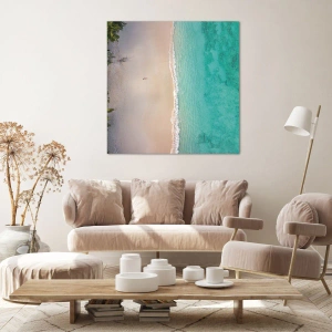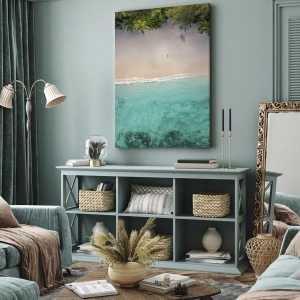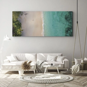 - Ce tableau représente une plage tropicale pittoresque vue du ciel, où l'eau turquoise rencontre le sable clair bordé de palmiers. Il s'intègre parfaitement aux intérieurs conçus pour respire la tranquillité et une atmosphère exotique.