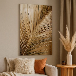- Une feuille de palmier dorée sur fond uni. Une composition minimaliste et élégante, parfaite pour les intérieurs modernes et tropicaux, apportant subtilité et luxe.