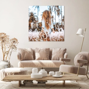 • Ce tableau représente une femme dans un champ herbeux avec des palmiers en arrière-plan, sous la lumière du soleil couchant. Décoration bohème élégante, il apporte harmonie et exotisme à tout intérieur.