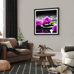 Affiche dans un cadre noir - Poster - Orchidées violettes sur fond de pierres et de bougies dans un cadre relaxant - 70x50cm - Se noyer dans la paix et la tranquillité - Décoration murale moderne pour le salon et la chambre ARTTOR