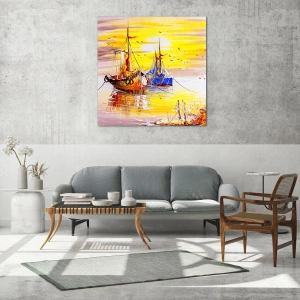 La peinture sur verre est faite sur un verre de 4 mm d'épaisseur. Les bords du verre ont une arête trapézoïdale mate. La tableau est sûr à l'utilisation et prêt à être accroché - il a des crochets en métal attachés à l'arrière du cadre et des entretoises en mousse permettant la régulation uniforme de la distance du tableau au mur.