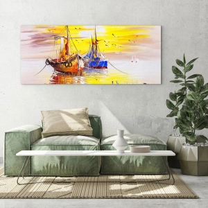 Impression sur verre - Image sur verre - Bateaux de pêche au coucher du soleil sur une eau calme - 50x70cm - Un repos bien mérité au port - Décoration murale moderne pour le salon et la chambre ARTTOR