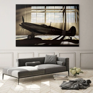 - Cette peinture sur verre représente un avion militaire dans un hangar, jouant avec l'ombre et la lumière. Un choix idéal pour les passionnés d'histoire militaire et d'aviation.