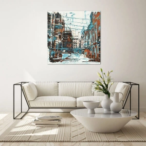 La peinture sur verre est faite sur un verre de 4 mm d'épaisseur. Les bords du verre ont une arête trapézoïdale mate. La tableau est sûr à l'utilisation et prêt à être accroché - il a des crochets en métal attachés à l'arrière du cadre et des entretoises en mousse permettant la régulation uniforme de la distance du tableau au mur.
