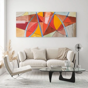 Cette peinture artistique s'intègre parfaitement à l'esthétique des intérieurs contemporains. Les formes géométriques confèrent à l'espace un style unique qui attire le regard et inspire. La surface en verre fait ressortir la profondeur des couleurs, renforçant l'effet visuel.