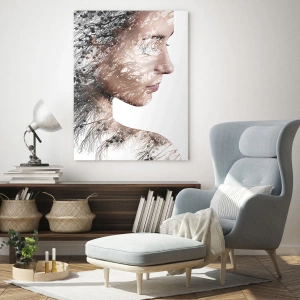 Le fond blanc souligne la délicatesse des détails, tandis que les branches sombres contrastantes, tissées dans la silhouette de la femme, confèrent au tableau profondeur et signification symbolique. Ce motif moderne s'intègre parfaitement aux intérieurs minimalistes, créant une atmosphère de paix et de réflexion.