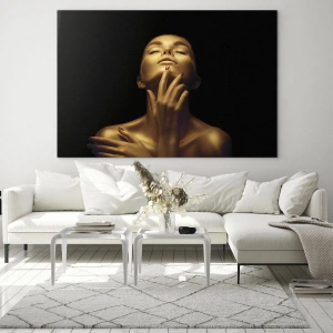 - Portrait de femme aux teintes dorées, exprimant sensualité et élégance. Ce tableau s'intègre parfaitement aux espaces modernes et lui confère un caractère unique.