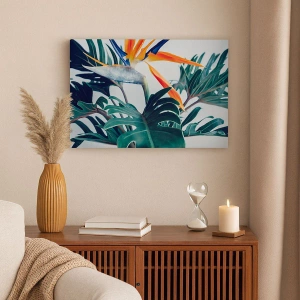Impression sur toile - Image sur toile - Fleur de Strelitzia entourée de feuilles sous une lumière vive - 50x70cm - Le buisson oiseaux - Décoration murale moderne pour le salon et la chambre ARTTOR