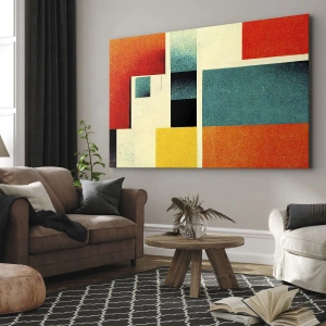 - Cette toile imprimée de 70 x 50 cm représente une abstraction géométrique composée de rectangles et de carrés colorés. Parfaite pour les intérieurs modernes et élégants.