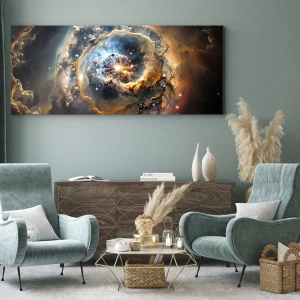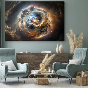 Impression sur toile - Image sur toile - Une vision abstraite d'une explosion cosmique dans des tons d'or et de bleu. - 70x50cm - Le début - Décoration murale moderne pour le salon et la chambre ARTTOR