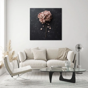 - Un charmant hortensia séché sur une surface sombre et mate. Les pétales tombants soulignent le naturel et le romantisme de la composition, créant une décoration murale subtile pour les intérieurs paisibles.