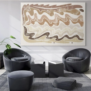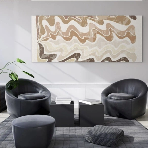 - Une peinture abstraite sur verre aux tons beige et marron, ornée d'un motif de vagues. Ses couleurs douces et ses formes fluides s'intègrent parfaitement aux intérieurs calmes et modernes des salons, chambres ou bureaux.