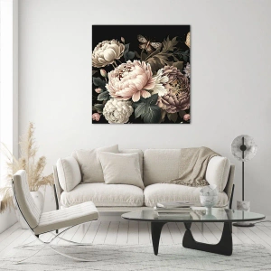Le tableau « Style baroque » est un hommage au classicisme et au romantisme. Il représente une composition florale luxuriante sur un fond noir profond. De délicats pétales de pivoines, de roses et d'autres fleurs de jardin entourent deux papillons subtils, apportant légèreté et finesse naturelle à la scène.