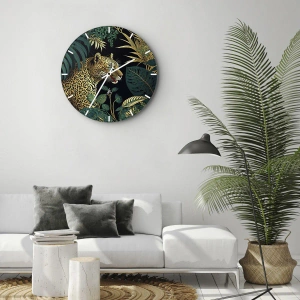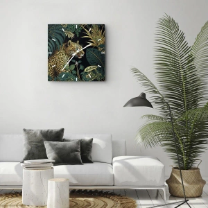 Horloge murale - Hôte dans la jungle - Léopard parmi les feuilles tropicales sur fond noir