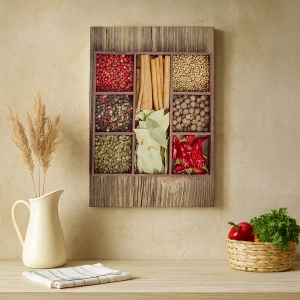 Décoration murale - Titre inconnu - Boîte en bois avec diverses épices dans des compartiments