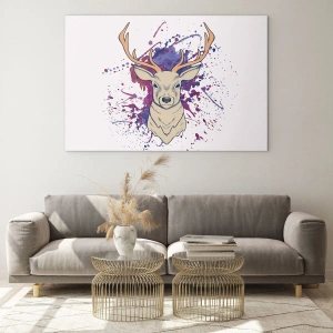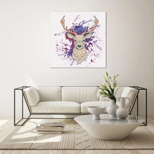 Dans ce tableau, chaque ligne, chaque forme et chaque couleur reflètent la nature. Le cerf, dans sa majesté, s'intègre harmonieusement à l'espace environnant, et le fond, aux tons violet, bleu, orange et rouge, ajoute énergie et intensité à l'image. La silhouette du cerf est symbolique, reflétant à la fois force et paix, et sa présence sur fond de couleurs montantes confère de la profondeur au tableau.