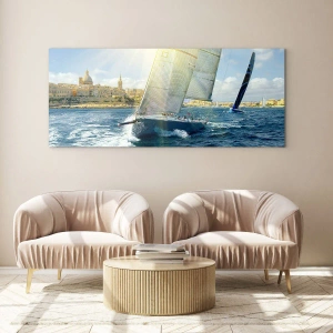 Impression sur verre - Image sur verre - Un yacht naviguant avec en toile de fond une ville par une journée ensoleillée - 70x50cm - Il est temps de quitter la ville - Décoration murale moderne pour le salon et la chambre ARTTOR