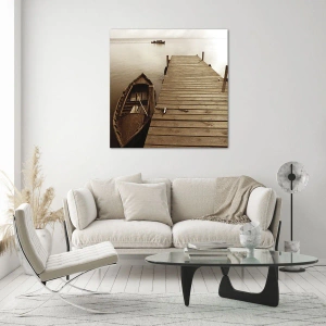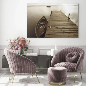 Impression sur verre - Image sur verre - Un bateau sur un quai sur un lac calme en sépia - 50x70cm - Le grand silence - Décoration murale moderne pour le salon et la chambre ARTTOR