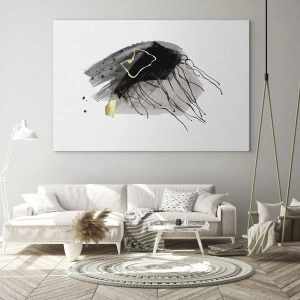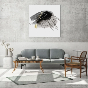 La tache noire principale, complétée par de délicats accents dorés, attire l'attention par sa simplicité et sa sophistication. Le fond blanc souligne l'harmonie des couleurs et confère à l'ensemble une légèreté qui en fait un élément idéal pour les intérieurs modernes.